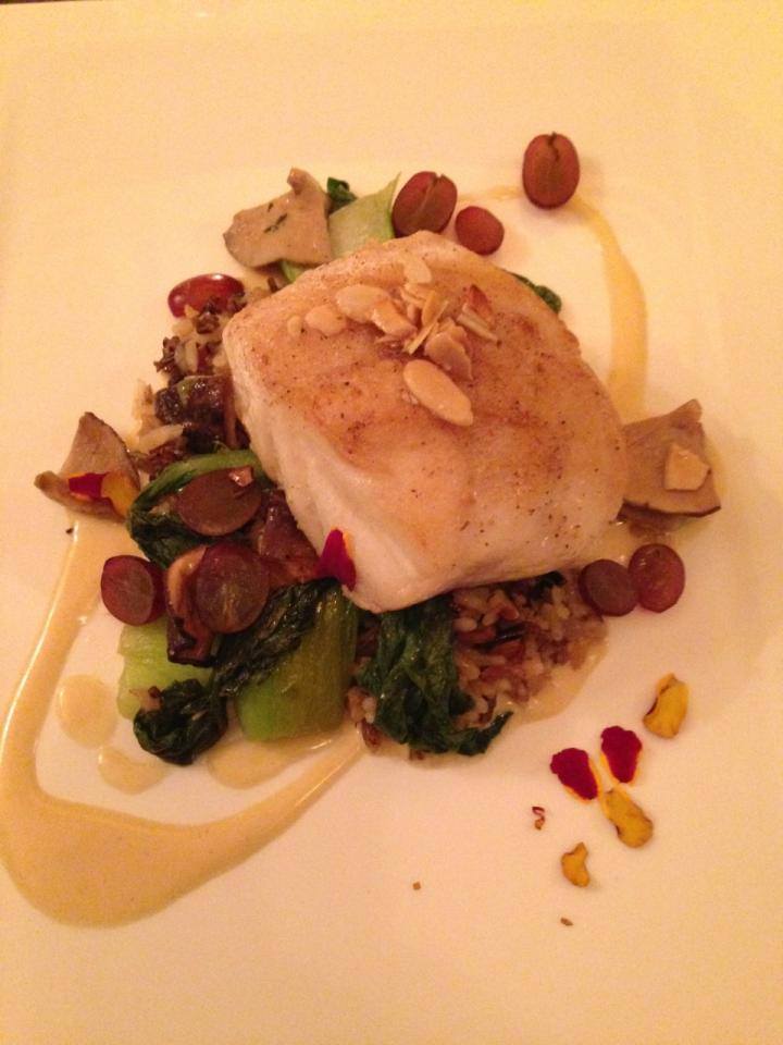 Grouper with almonds on top of wild rice, wild mushrooms, bok choy, grapes and horseradish with parnip puree