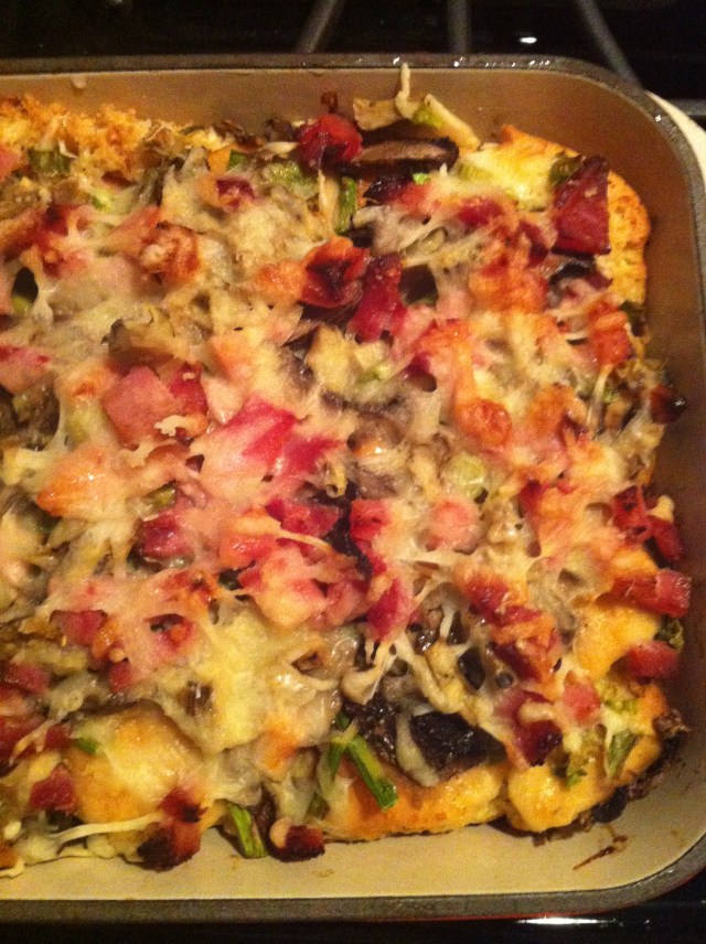 First on my list is to adorn Sister Schubert dinner rolls with an egg custard studdeed with roasted artichokes, grilled asparagus, crimini mushrooms, green onions, ham, and pecorino romao cheese. All of the “toppings” are purposely placed “on top” so that the dish is more like an eggy foccacia rather than a mudane casserole.