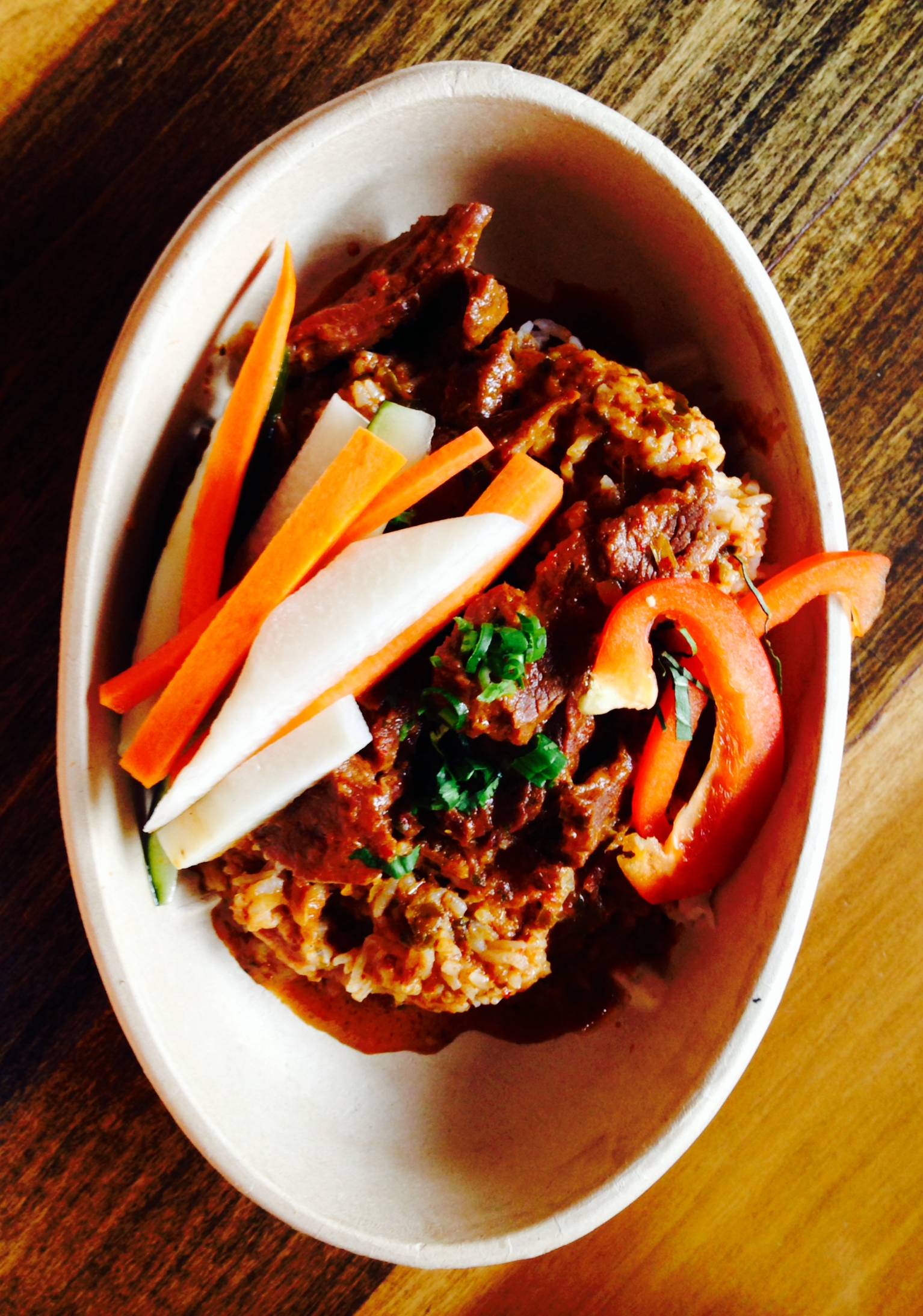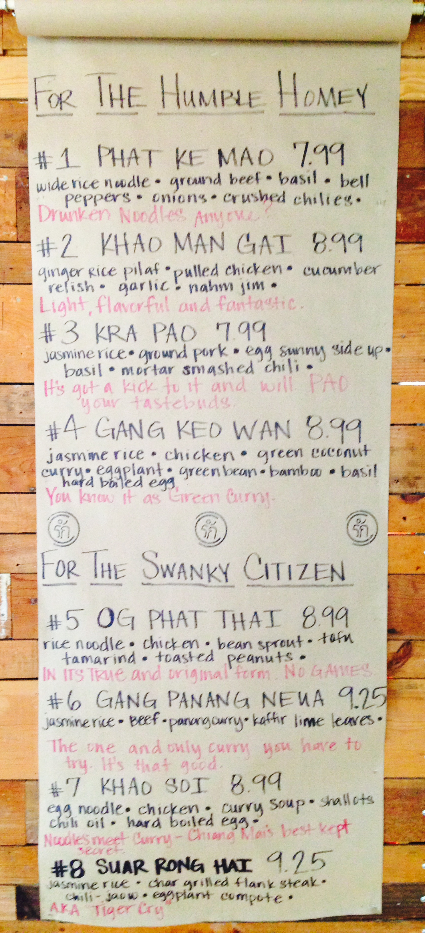 The staff is friendly, helpful, and knowledgeable. Great, you might say! Well hold on just a second. They also completely disregard any special requests. Two of us specfically asked that no crushed chilis be used. Not only were they used but they were used aggresively! We later found out that this is the norm. Apparently the owners don’t care what you want the level of spice to be. Their mindset is that if you alter the ingredients then the experience won’t be all that it can be. The effort takes Thai food back to its’ humble beginings where heat is aggresive but truly the focus is more on spice and many flavorful components. But while your mouth is on fire, your hair is drenched in sweat, and your toes are tapping uncontrollably it’s hard to distinguish the salty, the tangy, the citrusy, and the sweet notes often associated with this fare. Had the the person who took our order let us know that they do not veer from their recipe we would have been better prepared in our minds for the explosion that was to come. All this being said, Crushcraft’s attempt at making a distinctive mark on the Thai scene in Dallas is successful. The menu is small. The offerings, although presented in disposable container, are pleasing to the eye.