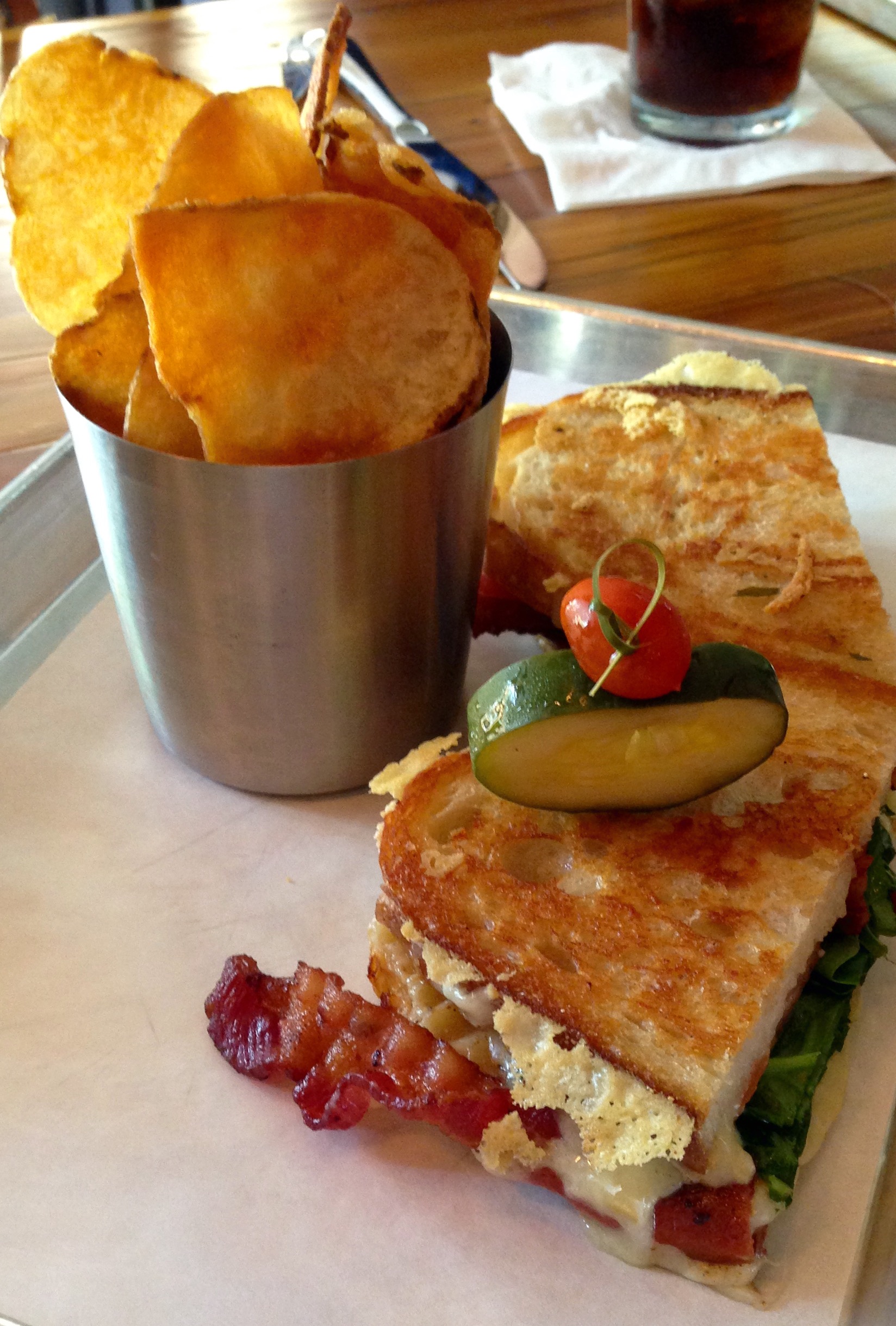 Until today, thinking of a grilled cheese, I think of my mom’s served on a night that she and dad would be going out for the evening. Until today, thinking of a grilled cheese takes my mind to being seated at the counter in the Highland Park Pharmacy. But today, the simplicity of those sammies seems old school. Millennials want something different. Today’s patrons wants a twist. Young palates crave ingenuity. Our group tried a number of sixteen cheesy gooey selections. The Caprese was a highlight. Grilled sourdough is slathered with garlic compound butter, fresh mozzarella, sliced tomatoes, fresh basil, and homemade basil pesto.