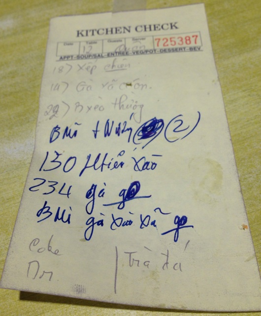 Our server acted more like a guide, a docent if you will, taking us through the back streets that Johnson and O’Hare traveled while in Northern Vietnam. Knowlegeable yet unpretentious, you could tell that the young lady was proud of the food she was serving. As an amusing aside, the waitress informed us that we were welcome to leave a dolar bill if we wanted to “buy the kitchen guys a beer”.