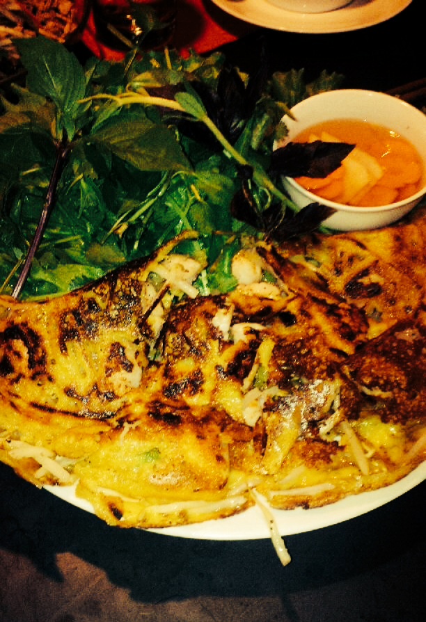 Made with rice flour and tumeric the Banh Xeo were filled with shrimp and scallions and fried in Coconut Oil. We gingerly folded them into green leaf lettuce cups filled with the bounty of fresh herbs mentioned above. A sauce predominately composed of fish sauce and a housemade chili sauce were on hand for dipping.